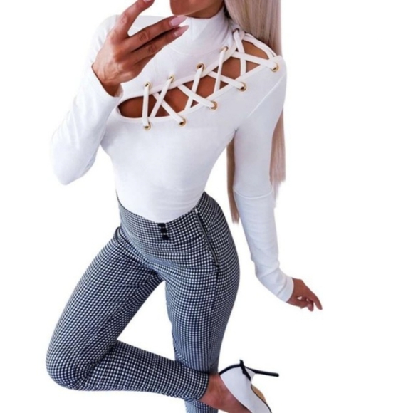 Long sleeve mock neck top with eyelet and laces in the front and tear drop opening in the back.