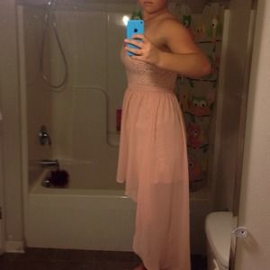 Lace, sweetheart neck line, high to low, small hole where the zipper is from trying to get it on... Oops! It's an easy fix. I squeezed into it once for a wedding so it's in pretty good condition. Let me know if you have questions!
