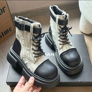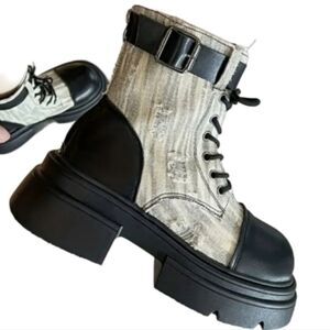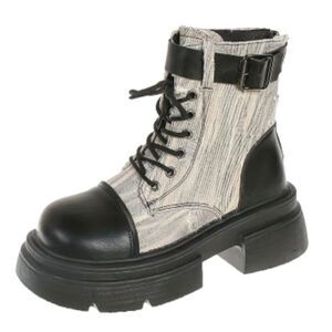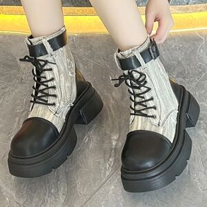 Women's Platform Combat Boots, Round Toe Buckle Strap Chunky Heeled Ankle Boots, Trendy Lace Up & Zipper Boots Beige denim