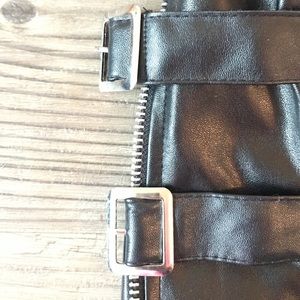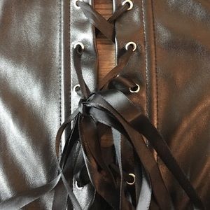 This snug, faux-leather corset zips up and buckles in front and laces up in back. It is form-fitting and extremely attractive when paired with the right shoes and accesories!
