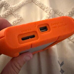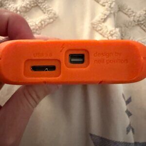 Great hard drive for photographers and other other creative professions. It has 1TB capacity and USB3 connection. Rugged orange bumpers protect it!