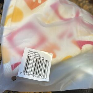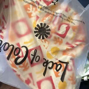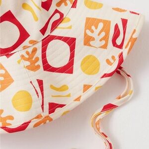 Stylish hat with vibrant geometric patterns. Features red, orange, and yellow designs. Perfect for sunny days.