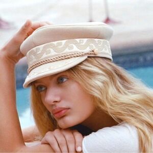 All aboard! This chic, vintage inspired sailor cap can be paired with any outfit to make a playful and fun statement. Trimmed with sailor button details, braided rope and a vintage Gonzo ribbon – nothing invites a day out by the water quite like the Riviera cap.
