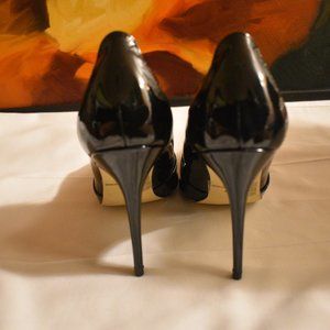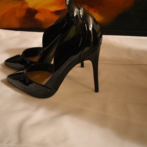 NWOT Women's black patent leather 4-4.5' heel pointed toe pump with scalloped designed and clear inserts at edge. True to Size. In Exceptional Conditional!!