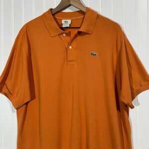 Lacoste polo shirt men’s size 7 XL, burnt orange short sleeve polo, crocodile logo shirt, made in France luxury sportswear, 100% cotton pique knit, retro Lacoste style, classic French tennis polo, preppy casual wear, heritage brand golf shirt.