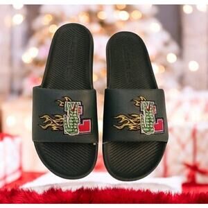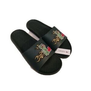 Elevate your summer wardrobe with these limited edition Lacoste Croco slides. The eye-catching design features a striped crocodile with flames and the iconic Lacoste logo in dark green. These unisex sandals come in a US size 12 and EU size 46 with a standard shoe width, making them perfect for any feet.