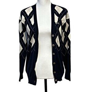 ✨Classic navy blue and off-white diamond pattern. Signature embroidered crocodile logo. Perfect for preppy, golf, tennis, Dark/Light Academia, vintage, or fall/winter style. Button-front, long sleeve knit.