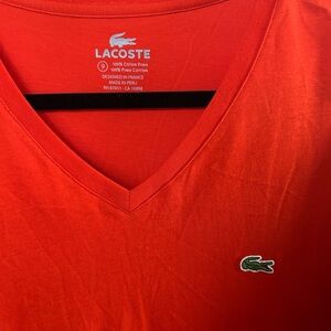 Vibrant red V-neck tee with Lacoste logo. Soft cotton fabric.