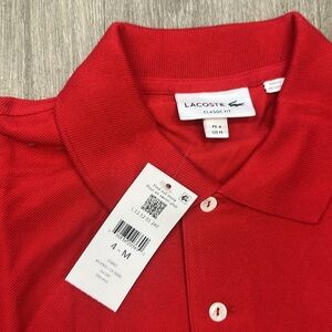 Timeless red polo by Lacoste. Features iconic crocodile logo. Ideal for casual wear.