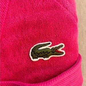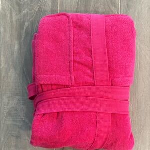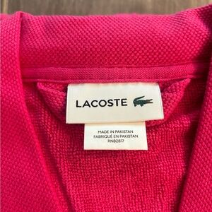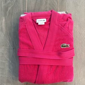 Luxurious pink bathrobe by Lacoste. Features iconic crocodile logo. Brand new still wrapped up, never used.