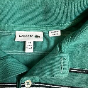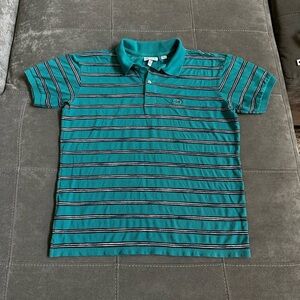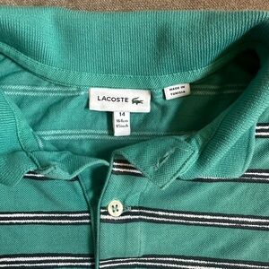 Classic green Lacoste polo. Features black and white stripes. Ideal for everyday style.