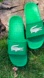 Stylish green slide sandals with iconic Lacoste logo. Perfect for casual wear./USED