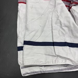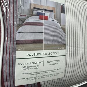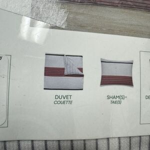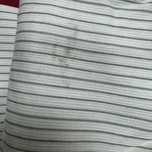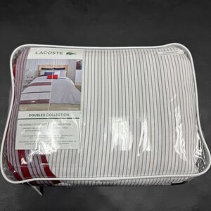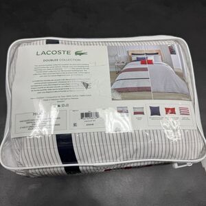This Lacoste duvet set is preowned, it does have a small dirty spot on the duvet , please see the last 2 pictures for this. It also has a strong laundry detergent smell, so it might need to be washed twice. Overall it looks great, no major defects.
