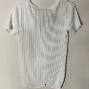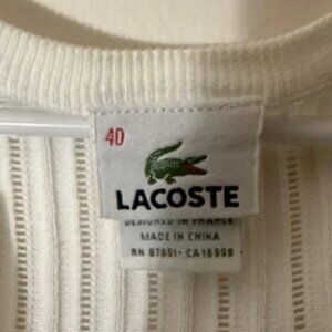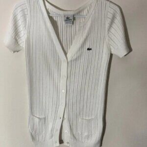 Elegant ivory cardigan with ribbed texture. Short sleeves and button-up design. Signature Lacoste logo on chest… this is in GREAT CONDITION… great closet staple.. MAKE ME AN OFFER