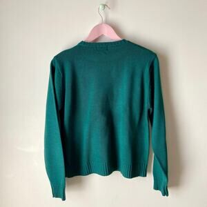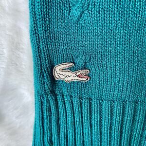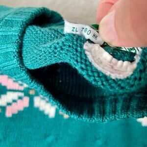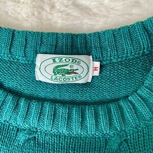 Super cute turquoise vintage crewneck long sleeve sweater with a snowflake-like print by Izod Lacoste. Great preowned condition other than one small stain on the front (pointed at in photos with a red arrow) but it may come out in washing. Size medium. Measurements in photos.
