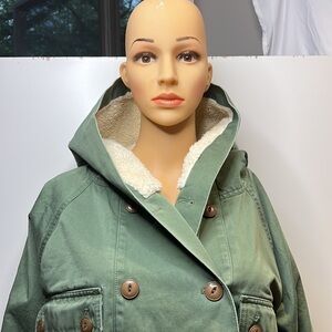 This is a beautiful Lacoste Live Sz XL Unisex Hooded Lined Button Trench Cotton Jacket Coat. Army green cotton lined with cotton shearling. A wonderful deep hood. Double breasted button closure. Dovetail back. Interior waist cinch. Four buttoned outside pockets. There are a couple of light spots on the front of the coat, as shown.