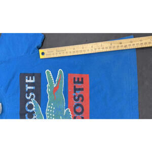 Lacoste Logo Alligator Preppy Basic Vintage Retro Designer Kids Tee T Shirt in USA Kids Size 7/8 in good to fair condition, as the graphic vinyl is peeling off .. otherwise shirt is in good preowned vintage condition.