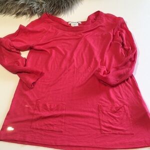 Lacoste- bright pink long sleeve T with front patch pockets and sheer chiffon stripe down sleeve - size 34 is equal to US XS - 16” Underarm to Underarm - 23.5” shoulder to hem