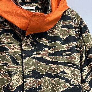 Excellent previously owned condition. Measurements are in the pictures. Unisex jacket in camouflage print ripstop, this Lacoste Live zippered parka features a detachable contrast hood and snaps. A trendy piece for the urban jungle.