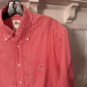 Excellent condition. Men’s Lacoste short sleeve button down shirt. Red & white check, embroidered alligator logo, 100% cotton. Size 42 ( Large). See photos for measurements