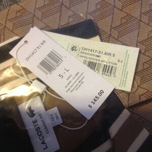 Up for sale is a brand new with tags men's Lacoste brown Monogram Jacquard short sleeve classic fit polo shirt, USA size large. This shirt is polyester, cotton & polyamide.