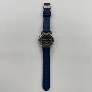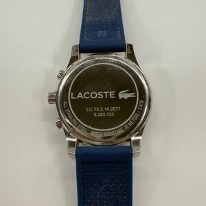 Sporty and elegant Lacoste men’s Quartz chronograph wristwatch with a 40mm stainless steel case and durable blue silicone strap. Features a white dial with three subdials (day, date, 24-hour) and the signature Lacoste crocodile logo.