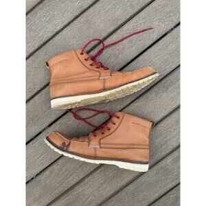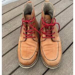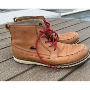 Stylish Lacoste boots in tan leather. Features bold red laces and signature logo. Ideal for casual wear.