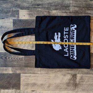 This is a Lacoste x Minecraft collaboration tote bag in black. It is in excellent pre-owned condition. The dimensions are approximately 15” tall and 15” wide, with a 9” handle drop, and the last two images show measurements. Lightweight soft 100% cotton fabric.
