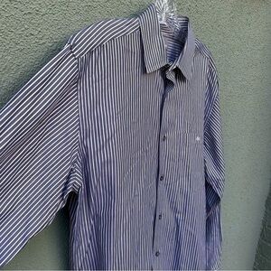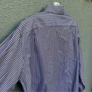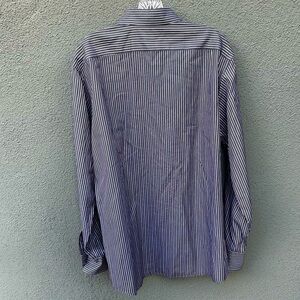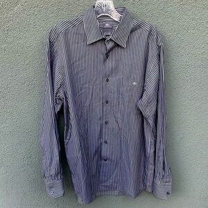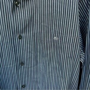 Excellent condition ( freshly drycleaned) Lacoste gray & white pinstripe button down. Collar buttons down at neck with pocket and Signature Lacoste crocodile embroidery logo on it.