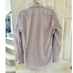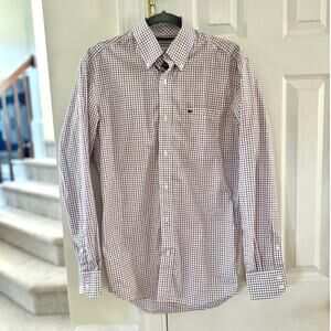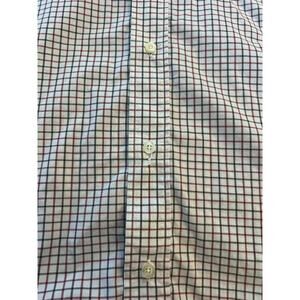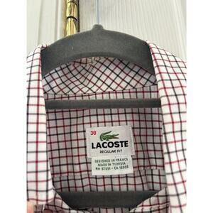 Good condition, there is a repair to a button hole second from the bottom. It looks like the button seam is just a little extended (see photo). It's not overly noticeable. White base with red and black checked plaid. Collared, long sleeve, button down. Front shirt pocket with lacoste logo.