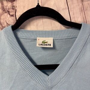 Stylish Lacoste sleeveless sweater vest in light blue. Features a classic V-neck design.