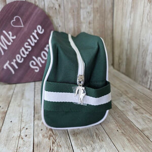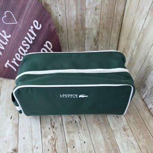 This is a Lacoste Parfums toiletry bag, new without tags or box. The bag is a dark green color with white trim. It features the Lacoste logo and "PARFUMS" printed on the front. The bag has a zipper closure with a Lacoste logo zipper pull. The interior is lined with a matching green material. There are no visible imperfections.