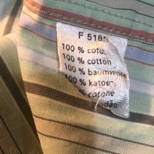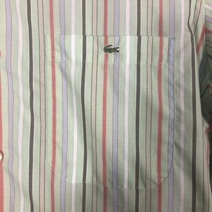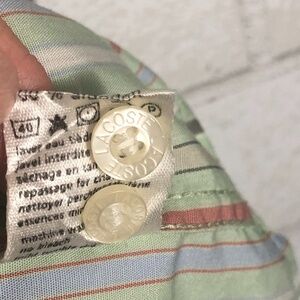 Lacoste Vintage Striped Mint Green Button Up. White, blue, orange, tan, brown colorway. Size 40 which is a medium, please see images. Pre-owned condition.