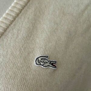 This is a cool and classic Lacoste wool blend sweater in Cream/Ivory. The size tag is missing but it measures like a slim size Large. It is in excellent condition without stains, tears or snags.
