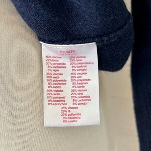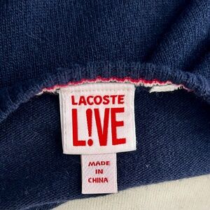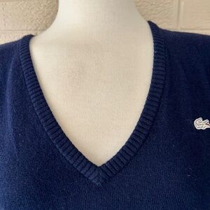 This is a cool and classic Lacoste wool blend sweater in Navy. The size tag is missing but it measures like a slim size Large. It is in excellent condition without stains, tears or snags.
