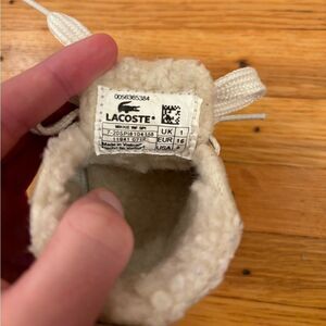 Lacoste beige/tan Sherpa lined lace up sneaker boots. Embroidered logo. Size US 2 (baby). A little dirty, but great condition!