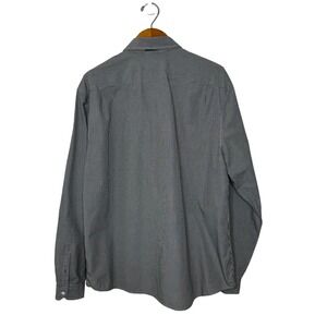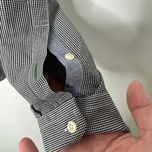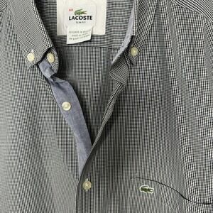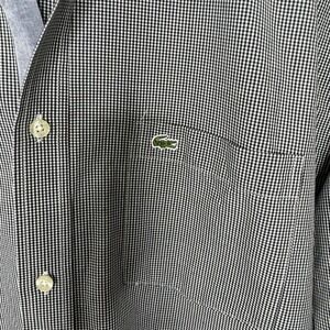 Lacoste button front shirt. Chest pocket. Micro check print. Slim fit. Faint small stain on sleeve.