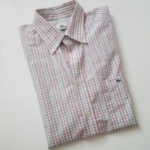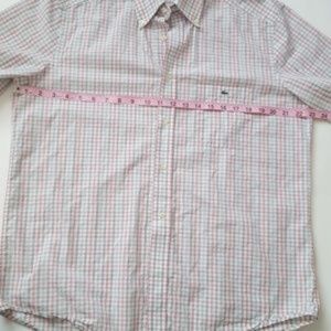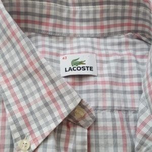 Lacoste men's short sleeve button up shirt. Size 43 Lacoste sizing fits like a medium-large. (See measurements for details). Used item: inspected for quality and wear. Pictures show any signs of wear and use. Bundle up! Offers always welcome:)