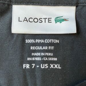 Lacoste size XXL T-shirt NWT black shirt sleeve 100% Pima cotton. Measurements 25” pit to pit and 29” from top of shoulder to bottom of hem in front. All measurements done lying flat and are approximate.