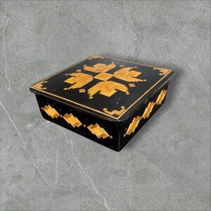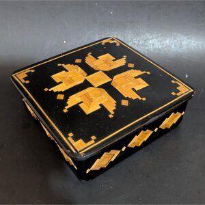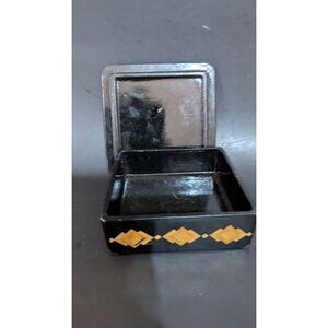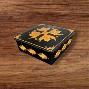 Lacquered Wooden Trinket Box With Geometric Inlay Black & Gold Vintage Handmade