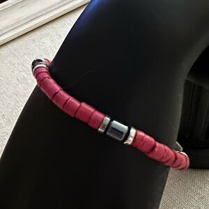 Lacrosse bracelet with stretch. Silver block w LAX On one side and lacrosse sticks in the back. Bracelet has pink wood beads and pewter and silver metal beads. 3.5” diameter. My guess is a size L