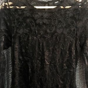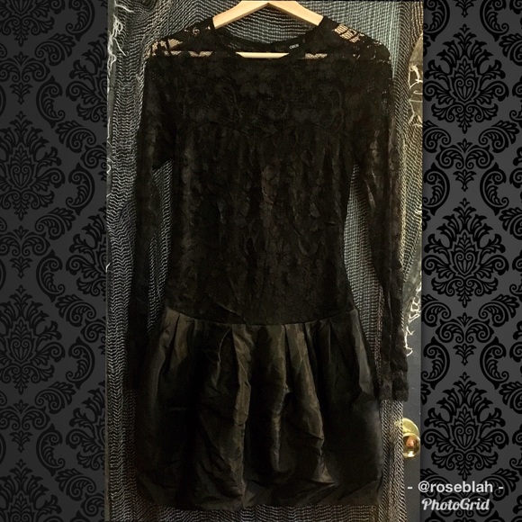 Cute little black dress. Modesty panel in front over the bits that count. No modesty panel in back, just lace. Drop waist. Skirt has a sort of tulle underlayer. Very short length.