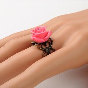 Lacy Bronze Victorian Style Pink Rose Flower Lucite Cabochon Adjustable Ring