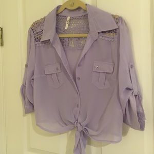 Crop top has a tie in the front and and lacy top. Perfect for concerts or on the beach. Looks really good with high waisted anything! A summer/spring must have.
