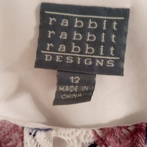 Purple and blue flowers adorn the white background of this lacy, crocheted-look dress by Rabbit Rabbit Rabbit. Youthful, above the knee length and form fitting with 3/4 length flared sleeves. Only worn once. Practically brand new. only one tiny flaw in the back by the shoulder to the arm sleeve seam. Indicated in the pic, barely noticeable. I left the thread in tact in case it can be worked back into the seam.