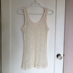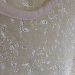 This is a cream colored lacy top. It is see through. I would recommend a white or complementary cami underneath. Dimensions are shoulder to bottom: 28 inches, armpit to armpit: 15 inches. I removed the tags so I don't remember the brand but I think I bought this at Macy's. I have worn it once to a summer wedding.