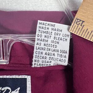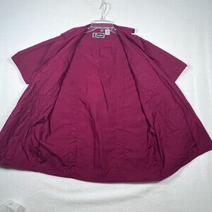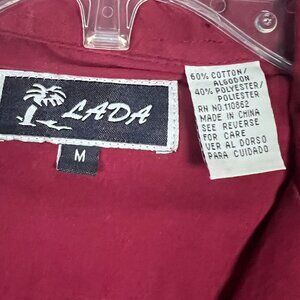 Lada mens button up shirt. Maroon Hawaiian theme with front embroidered design up both sides. Four pockets. Back detail runs up both sides also. Back has some spots of discoloration, photo 12-14.