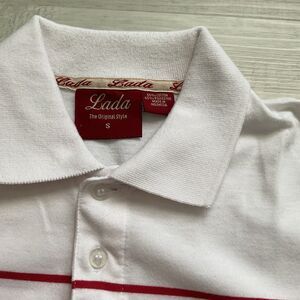 Lada The Original polo shirt in size small. This classic 90s retro piece boasts a white and multicolor stripe colorblock pattern, collared neckline, and button closure. Made of a comfortable cotton blend knit fabric with short sleeves, it is perfect for casual occasions and sports activities. The shirt features the Lada logo and belongs to the Ralph Lauren Polo Golf product line. Its quick-dry and breathable properties make it even more desirable. Don't miss out on this must-have addition to your wardrobe!