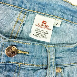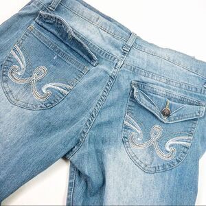 Light blue wash denim skinny leg jeans, mid-rise, exaggerated hip crease design, stitch embellished back pockets. Approx measurements: