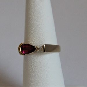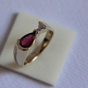 Ladies 14 Kt yellow gold-stamped- Pear shaped Pink Tourmaline and trillion shaped diamond ring. size 6 ⅟4. Bright 14 Kt gold finish with horizontal geometric motif. The Pink Tourmaline .91 Kt is Channel and “V” prong set with a 0.06 Kt diamond. Appraisal shown is from 1998 at $1,075. Current value has increased as gold has increased 500 %.